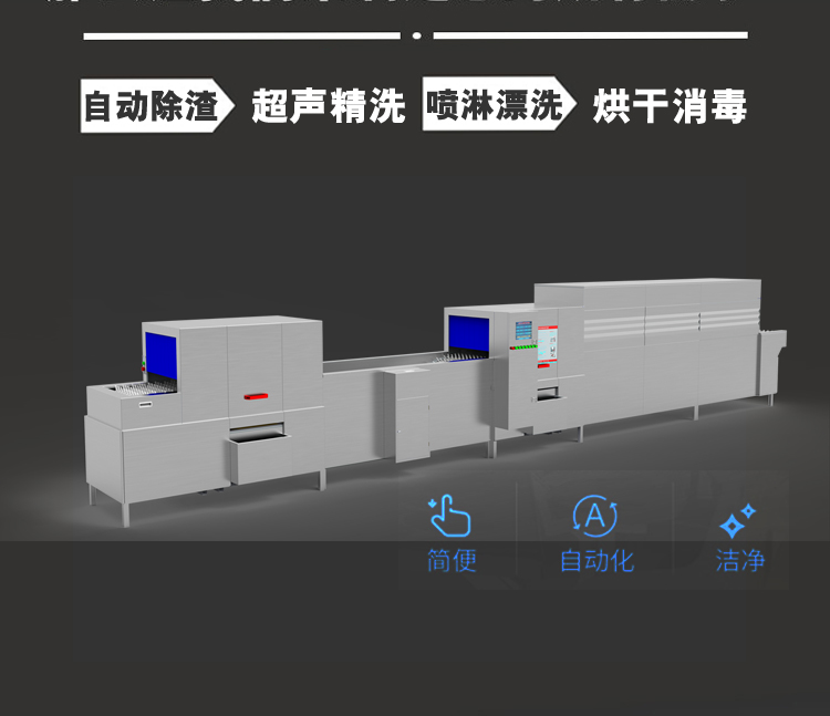 上超商用全自動(dòng)超聲波洗碗機(jī)用于中、大型食堂清洗各類餐具等,由噴淋除渣預(yù)洗段、超聲清洗段、噴淋漂洗段(含清水噴淋漂洗)、烘干消毒段四段及餐具定位傳送網(wǎng)帶、控制系統(tǒng)、安全防護(hù)系統(tǒng)等部分及主體框架構(gòu)成。核心技術(shù)為超聲乳化油脂,僅需少量普通洗潔精或食用堿,無需專用洗滌劑,即可達(dá)到良好的清洗效果。